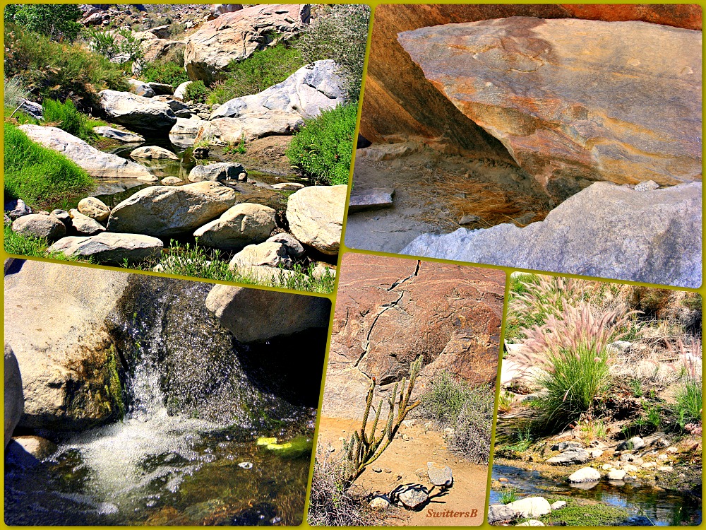 The Tahquitz Canyon hike is satisfying in that you quickly leave any sense of civilization, once leaving the visitor’s center. The rugged terrain surrounds a not too difficult journey. In that short distance (1 miles in to falls/350′ elevation gain) you enter a historical canyon (Cahuilla Indians) area that has a diverse habitat. Rock formations, foliage, the stream and vistas combine for a condensed experience. (more history)