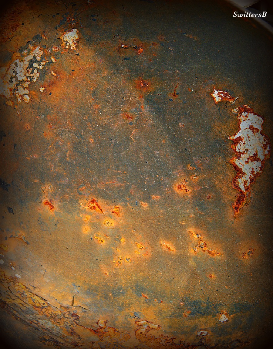 The earth revolving, the emerging sunrise marching across earth, islands, an eclipse, continents, volcanos, oceans and rust…all on an old fry pan hanging outside on a fence. Sometimes you just see what is and other times the imagination is tweaked.