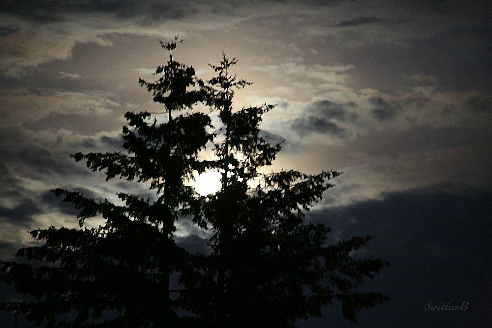 Oh my, kind of like bringing a bouquet of Dandelions to a garden party to show the moon from my vantage point when I compare Leyla’s I Lost My Lens Cap’s beautiful Luna shot…well wow! My shots seems a gazillion miles away in comparison…that said the high light actually may have been the Fir Tree sharing the horizon with the moon.