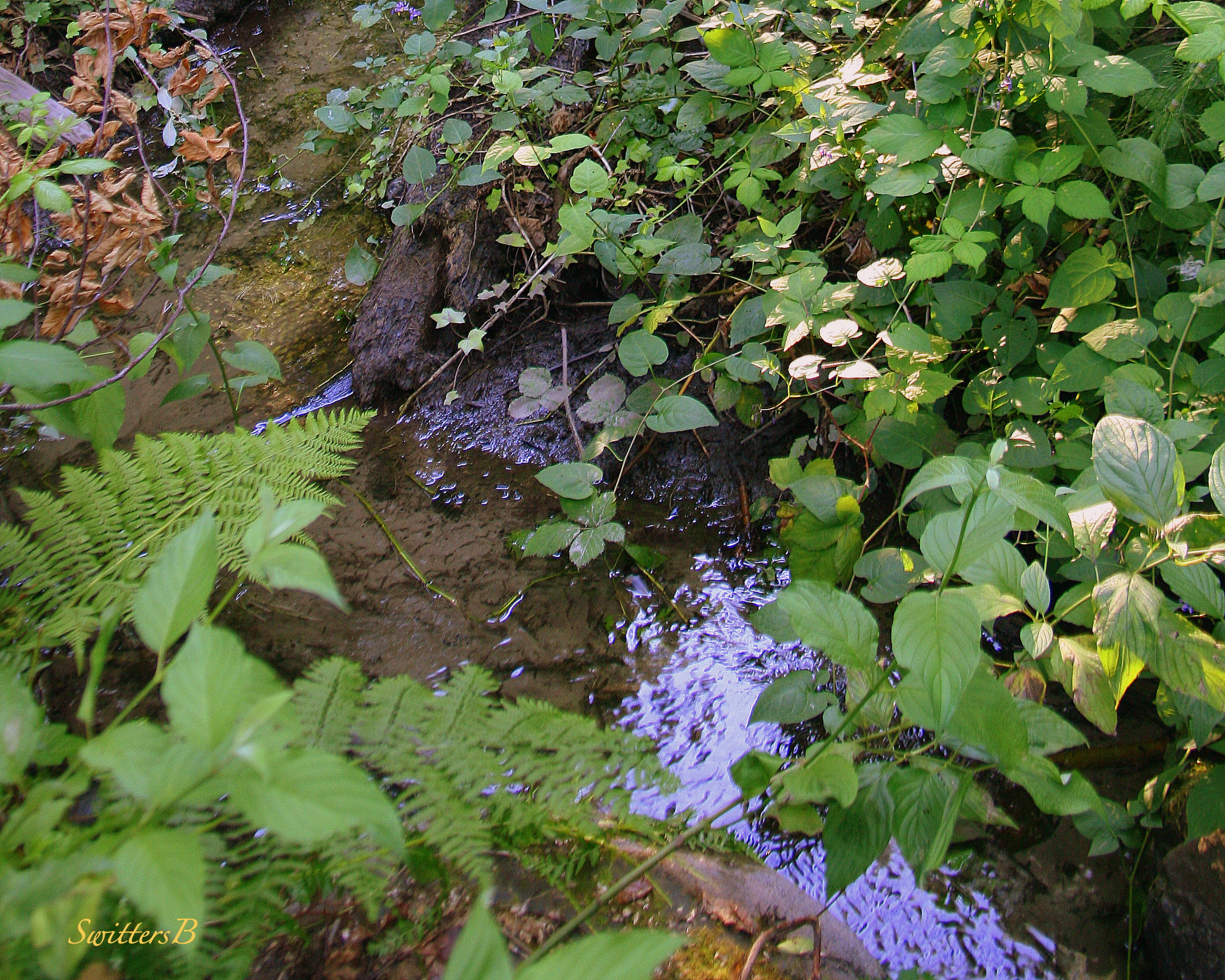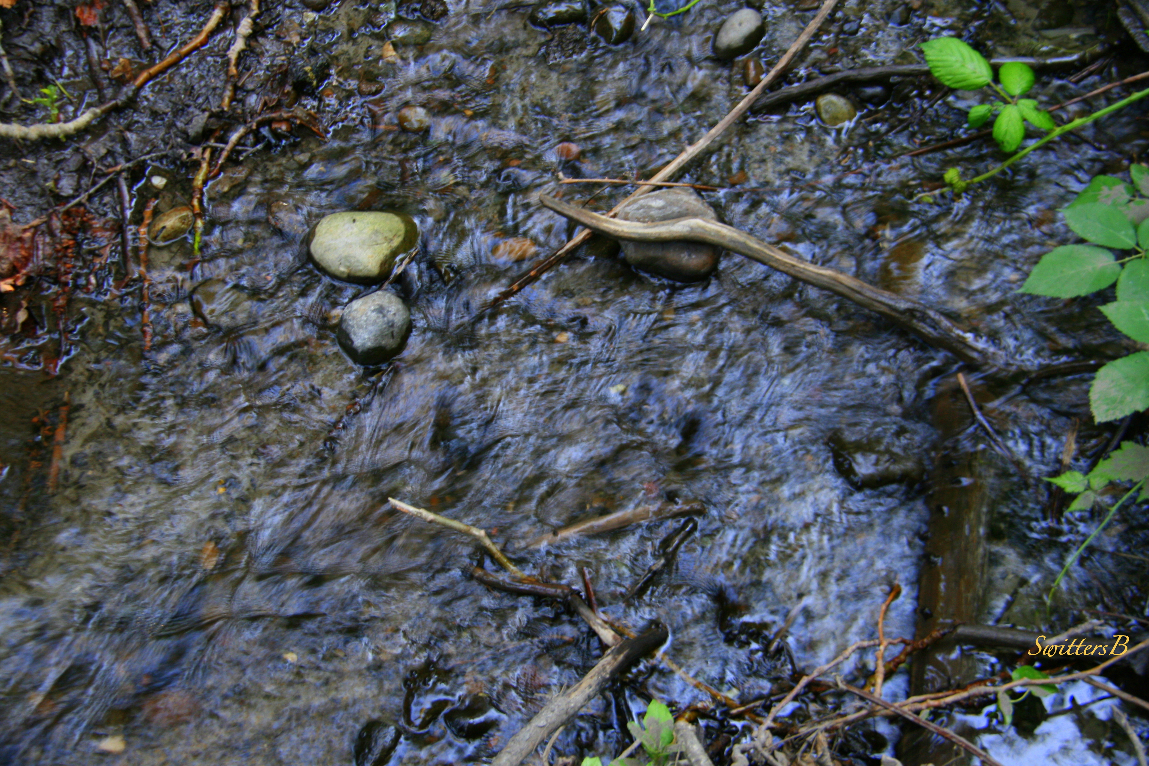 Notice the stones and the receding water marks on the stones. It hasn’t rained in several days, but when it did, the water table up hill, somewhere, had worked additional water downhill…hence the rise in level. Now the water was receding. The depth of the water is no more than two inches.