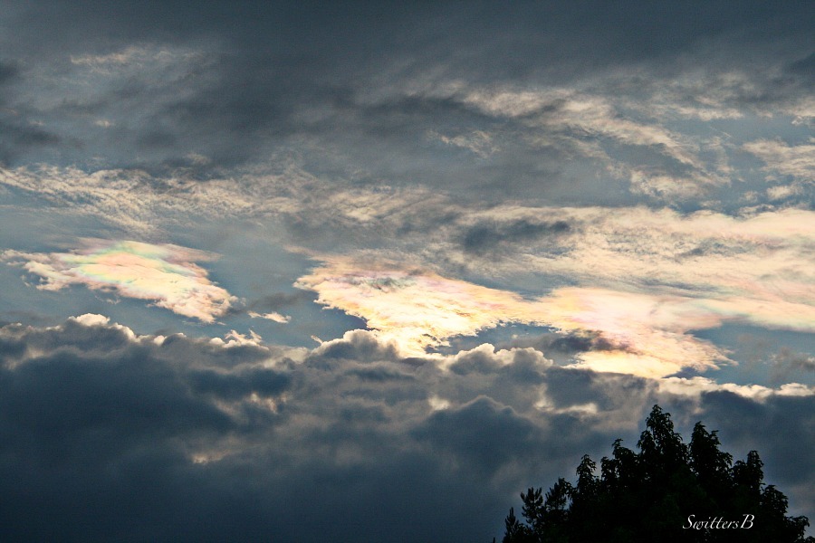Three colorful, mushrooming cloud formations showed between the other layers of clouds last night. The colors were almost like smushed up rainbows in these unique shaped clouds. I didn’t capture, with clarity, the texture/shape of the three clouds, but I had never seen this before. This Spring/Summer has offered up so interesting cloud formations, usually without the inclement weather.
