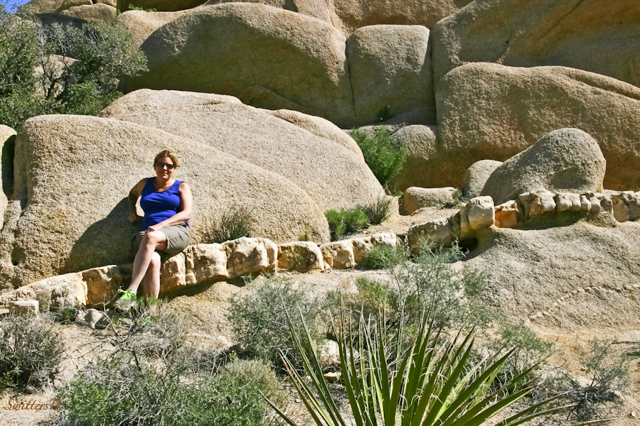 layers of rock via erosion in Joshua Tree Nat’l Park. The layer stretched on for about fifty yards. It sat there like some one was placing pavers through the desert. My wife sat atop one piece to give it scale.