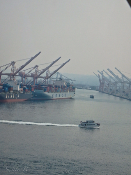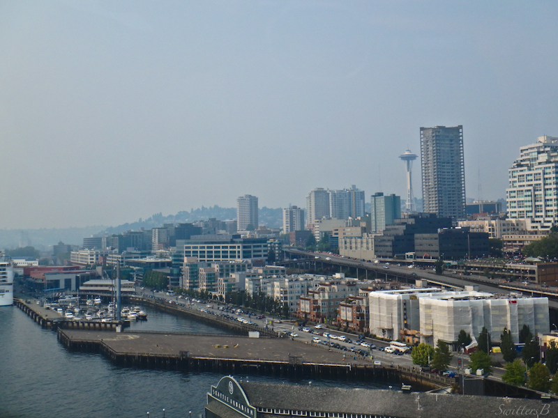 Yesterday, while in Seattle, we did a few of the touristy must do’s: Space Center, Pike Place Market, seafood down on the wharf and the Big Wheel ride. A ferris wheel is about the extent of my ‘thrill ride’ capabilities…a step above a Merry-Go-Round…my inner ear barely tolerates turning around too fast let alone more exhilarating gyrations. So the Big Wheel was a safe, interesting ride. Not given to fear of heights (because we were safely ensconced in a 6 passenger capsule) the ride was enjoyable. The smoke filled skies, from numerous wildfires to the East, obscured distant views. But, it was still an enjoyable event.