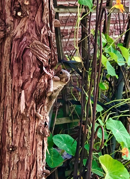 The squirrels are as busy as I have ever seen…digging up my flower beds, planter boxes and pots, ravaging the trees of seedlings and finding walnuts from who knows where, peanuts from the adoring neighbor ladies…planting here , digging up over there…some view them as a pest, nuisance, likable rodent. I don’t mind them so much.