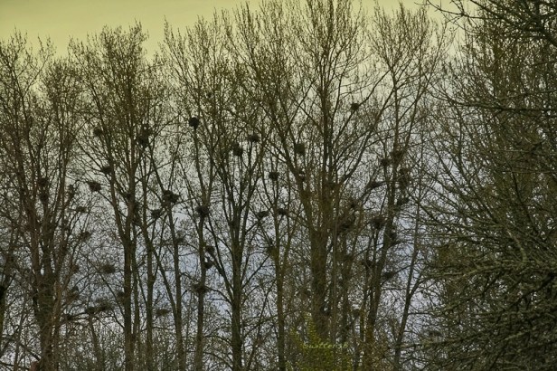 Every Fall, the nests for the large birds are quite evident once the leaves fall. This on Sauvie Island NW of Portland, Oregon.