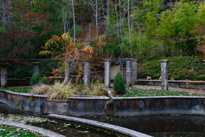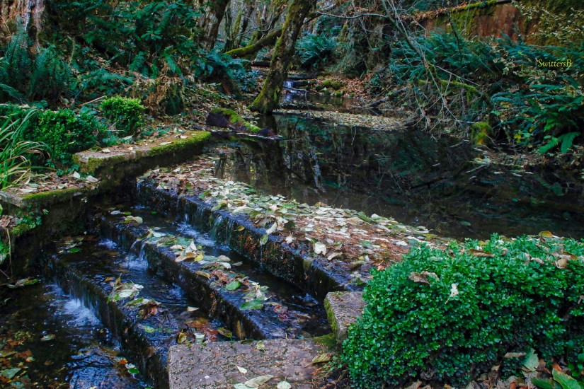 At Belknap Hot Springs in Central Oregon. One Frank Bigelow had a vision of a fancy ‘secret garden’ on the resort property in the early 1900’s. He diverted a portion of the McKenzie River for a source of power and also created the trickling water down he staircase into a pond with Euro style structures.